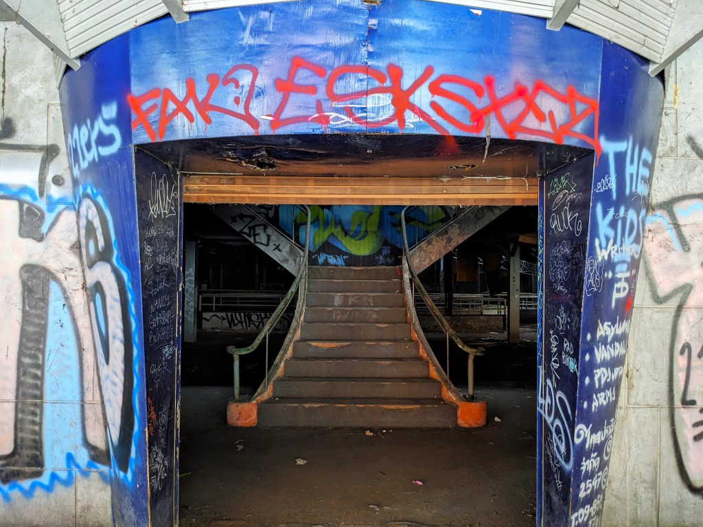 The original staircase was adorned with an arching sign but had collapsed onto the railings. We ducked down and climbed the stairs. From the viewing deck up top there were some great views of the unique shape of the front of the building. The original sign was so impressive in serving a retro reminder of its glory. Along the rest of the second story promenade, some well done art also caught my eye.