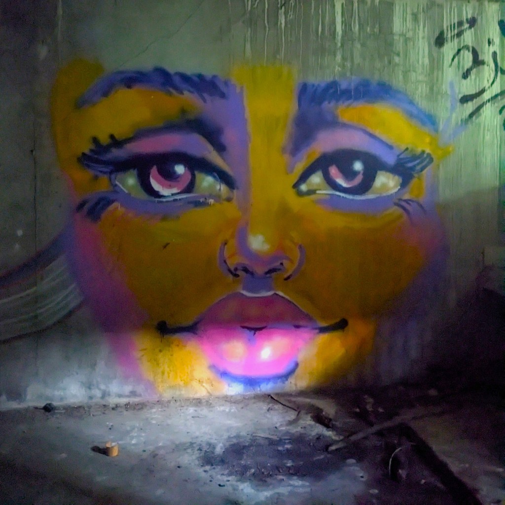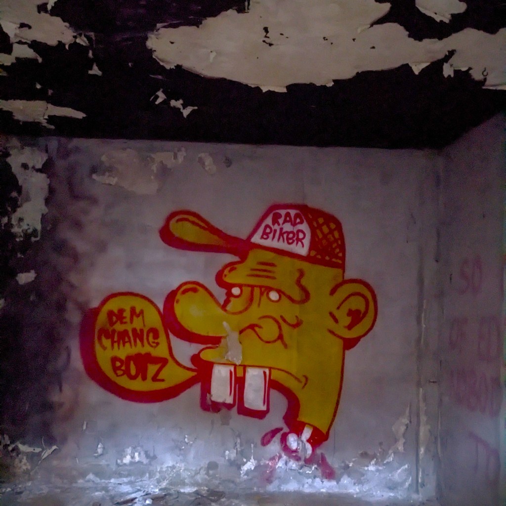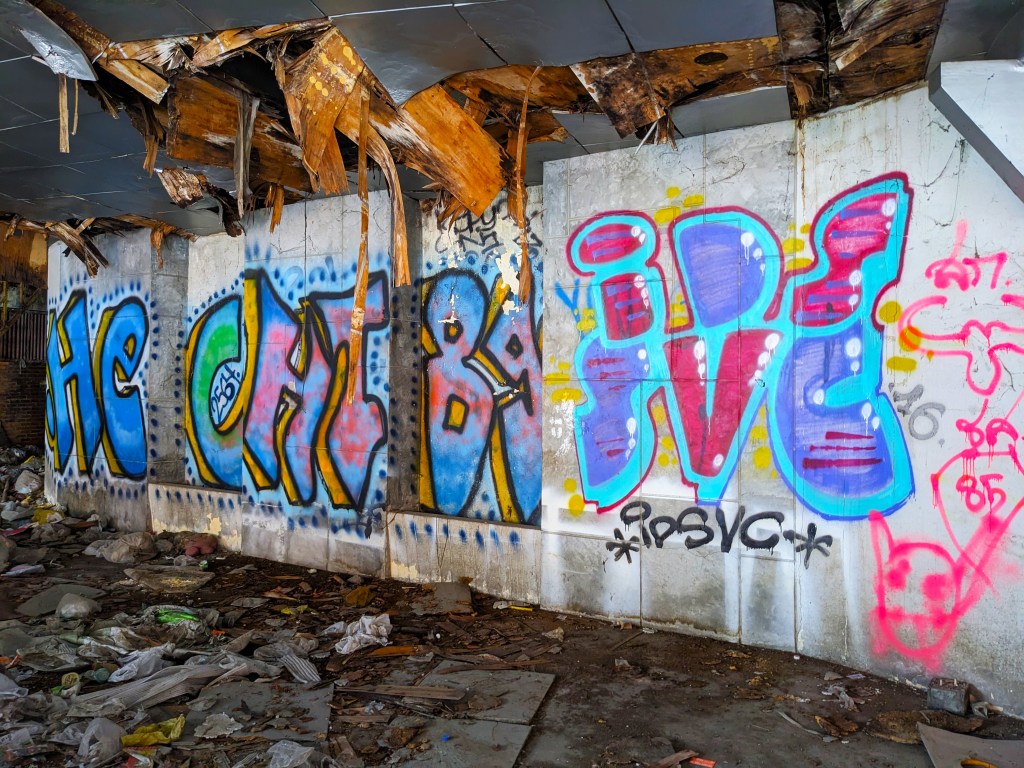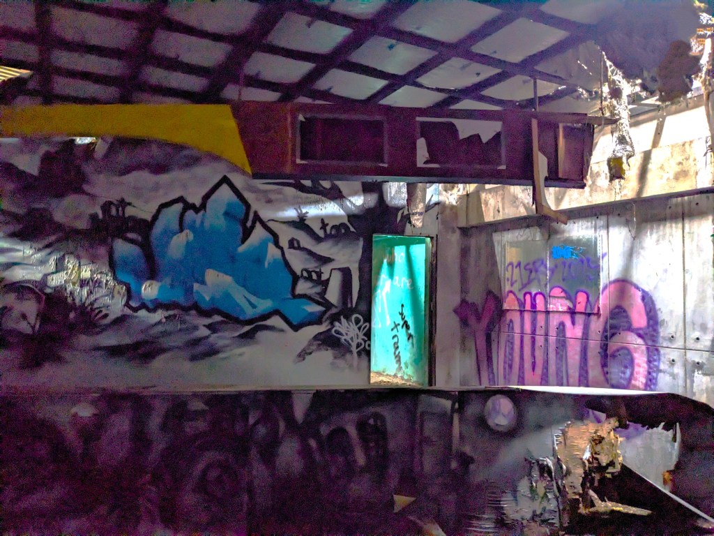 Once we entered the second floor, there was a split staircase and some more booths and side rooms. It was so dark that we couldn’t really explore much; there was so much trash on the floor and I was really unsure if the floors were solid. Also I wasn’t willing to dip my foot into the debris and get ankle-deep to find out. The art inside the second floor was more impressive but rare.