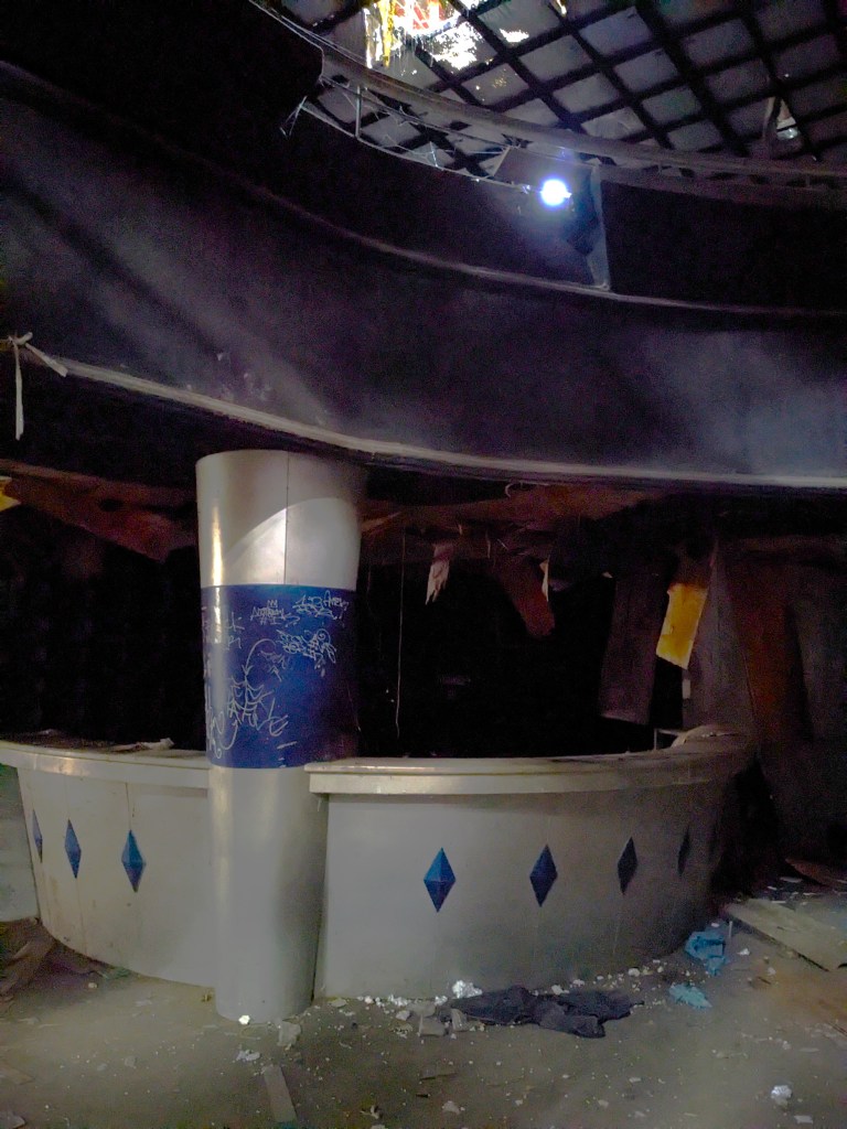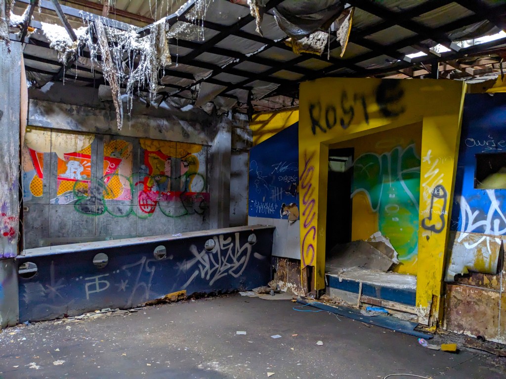 First we went to the bottom floor past the parked cars. We entered the bottom floor of the rink. The structure of the actual skating rink was very much compromised. The outer rails were there but the wooden floor pieces were ripped up with not much remaining beyond the cement base. We could see remnants of the party rooms and various booths. Around the walls were some graffiti, but less than what I was hoping for. We were ready to see what the second floor looked like.