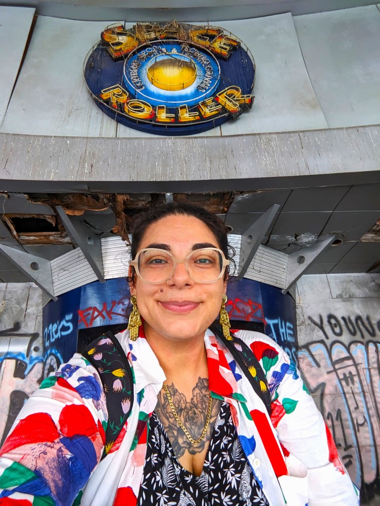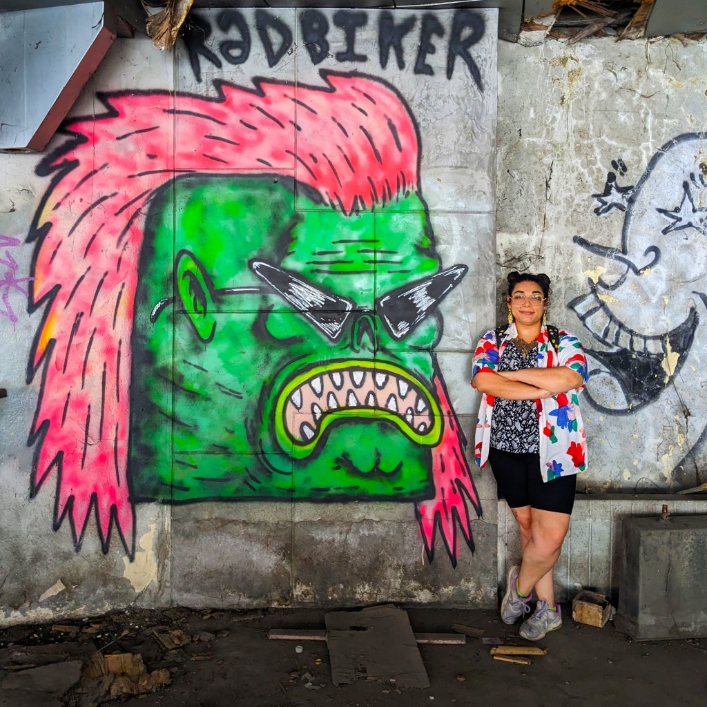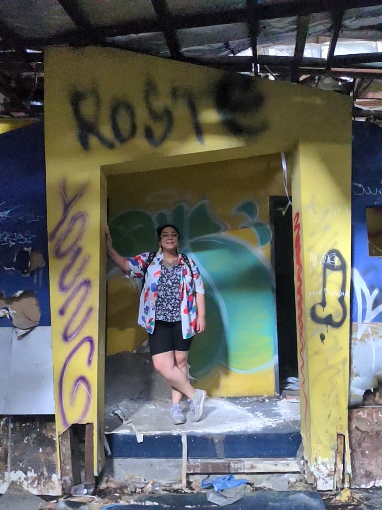 We walked up to the building; the sign and stairs were still visible and she was gorgeous. The bottom part was being used for a parking lot and the area between the rink and the building to the right exposed some of the roller rink’s foundational bones among beautiful tropical vines and foliage. We could see some street art peeking out as well. So we walked back around and entered the parking lot. It was time to go inside.
